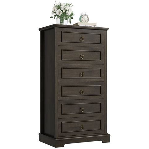 Bring a warm and classic design to your space with this 6-drawer dresser. We love all the elegant details from the crown molding and inset paneling to the round, brass-finished drawer pulls and versatile finish. This dresser is made from engineered wood, and it rests on short, cabriole-inspired feet. The six drawers open on roller glides, revealing room for clothes, extra linens, and delicates. On the surface, you can display accent pieces and a table lamp. Plus, this dresser has a finished back that makes it easy to place against any wall in your living room or bedroom.